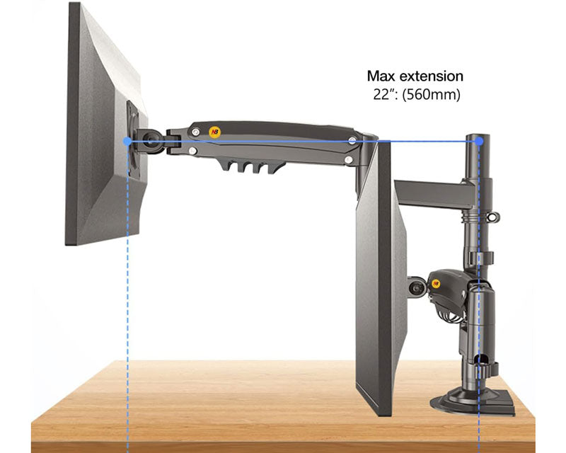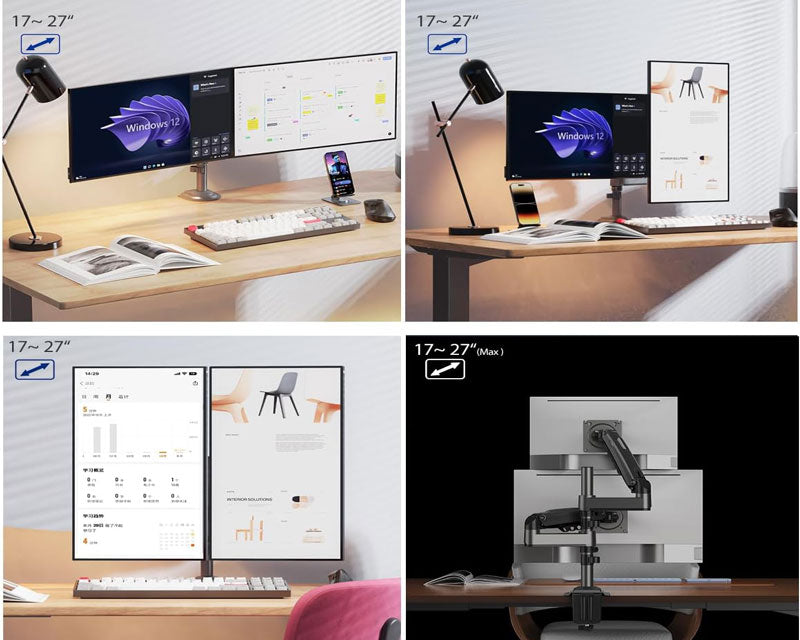 Karakteristike - Tip: Stoni nosač za monitor Montiranje: VESA 100mm x 100mm,VESA 75mm x 75mm Podržane dijagonale: 17 inča - 27 inča Nosivost: 2x 9kg Dodatne mogućnosti: Podesivost po visini,Rotiranje,Swivel,Tilt Uglovi pomeranja: Rotacija ekrana 360 stepeni,Swivel ± 90 stepeni,Tilt -30 stepeni +85 stepeni,Upright 260mm Ostalo: Montaža dva monitora Reklamacioni period - Reklamacioni period: 24 meseca